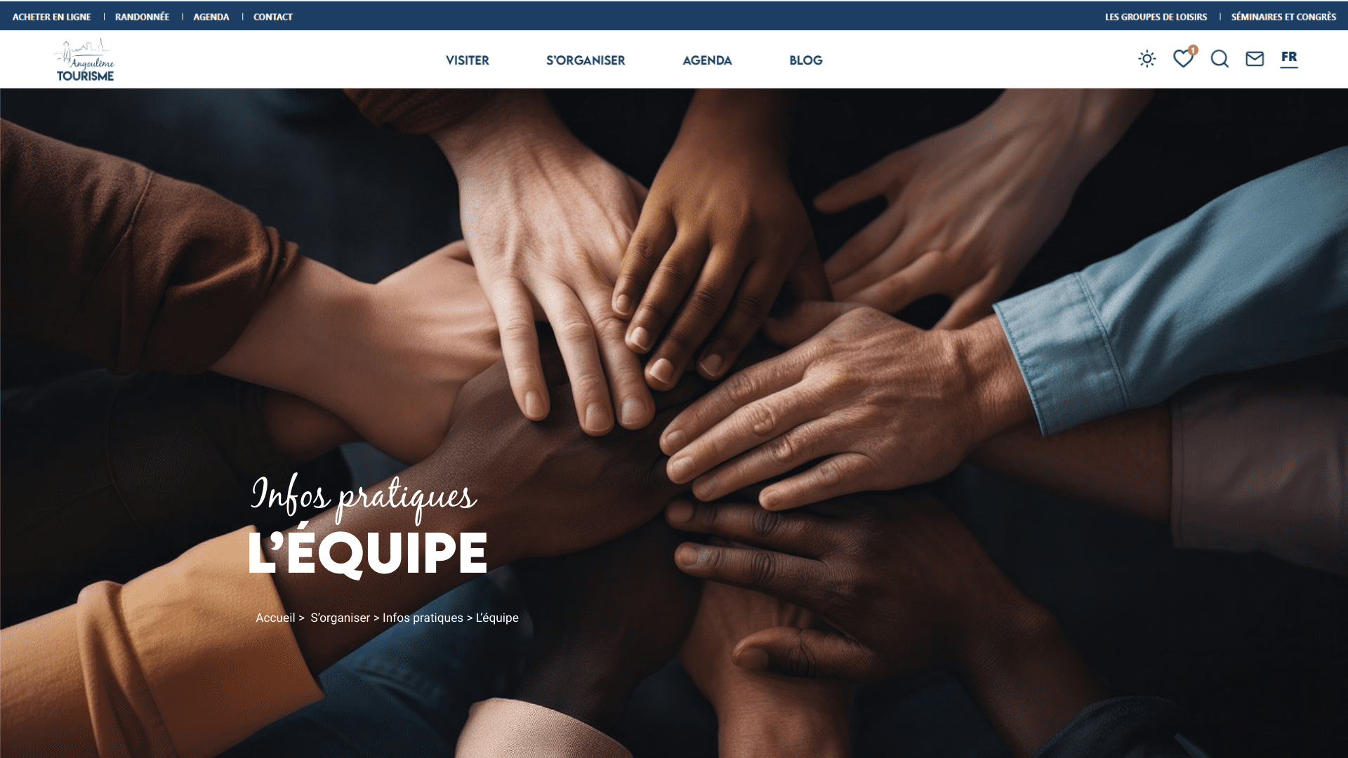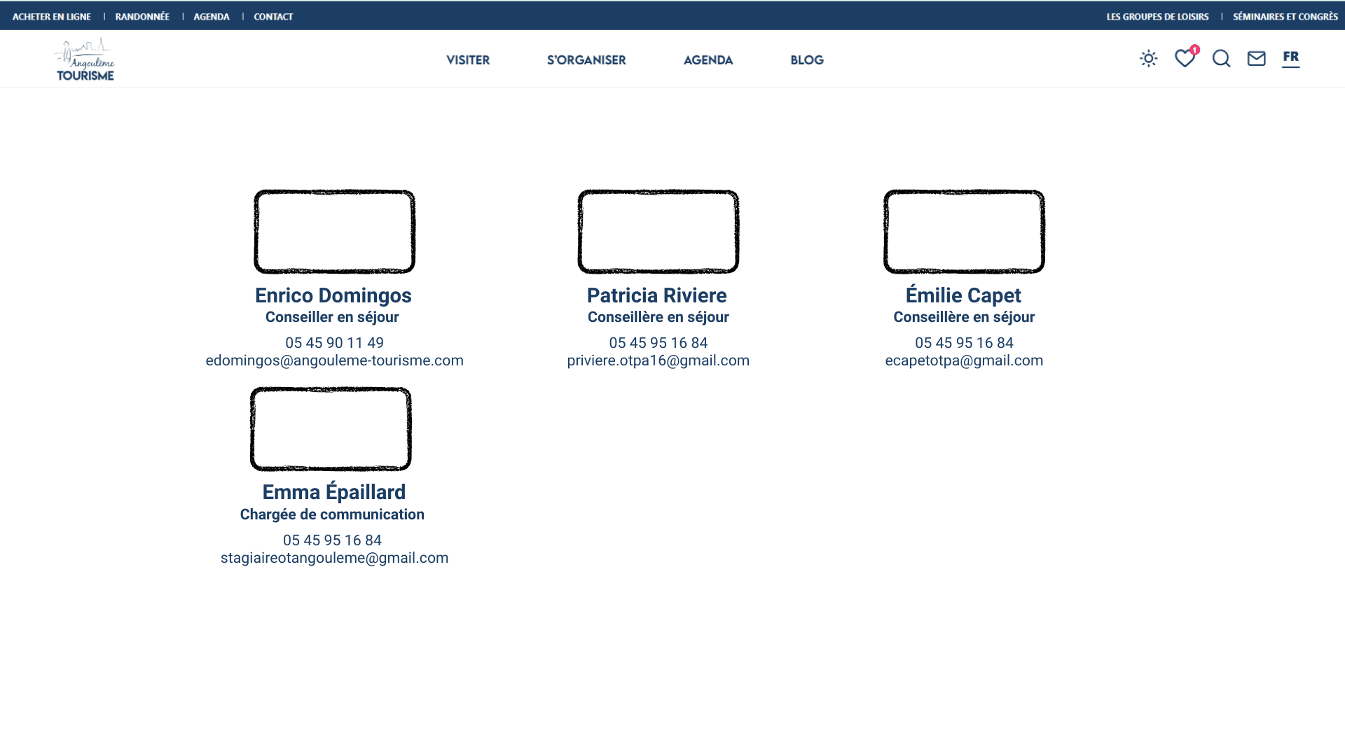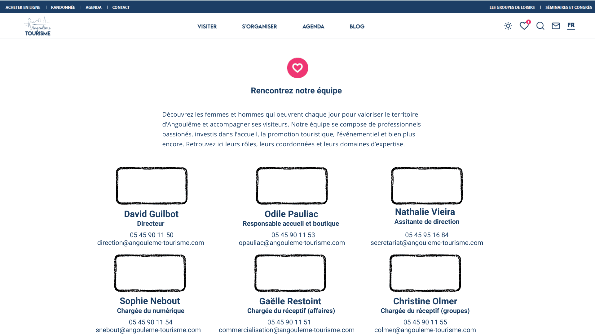 En parallèle des projets principaux sur lesquels j’étais mobilisé, j’ai également proposé des idées d’amélioration pour site de l’Office de Tourisme existant. Parmi ces suggestions, j’ai soulevé l’absence d’une page dédiée à l’équipe, ce qui limite la dimension humaine du site et empêche les visiteurs, partenaires ou prestataires de savoir à qui s’adresser ou de mieux connaître les personnes qui composent la structure.